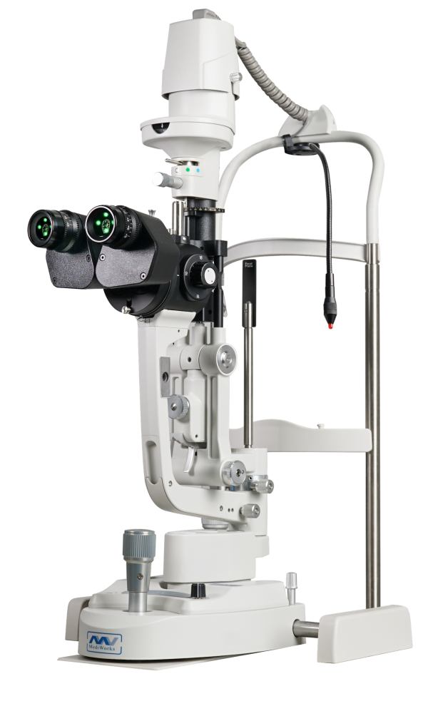 The Mediworks 360 series is a “Haag” style tower slit lamp with LED illumination and optional 3x Drum (S360S) or 5x Drum (S360) magnification.